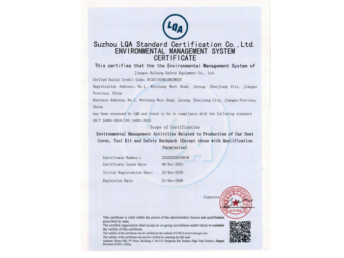 环境管理体系认证证书